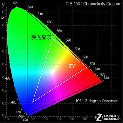 激光光源由于使用純度非常高的紅、綠、藍(lán)三原色光源,能實(shí)現(xiàn)遠(yuǎn)遠(yuǎn)大于傳統(tǒng)NTSC或DCI最小色彩范圍的色彩空間,能展現(xiàn)大部分人眼可以識(shí)別的色彩。而無論采取哪種白場(chǎng)色度標(biāo)準(zhǔn),對(duì)于紅、綠、藍(lán)三原色可以分別精確控制的激光光源很容易實(shí)現(xiàn)。而目前大多數(shù)投影機(jī)使用的氙燈光源就需要通過濾色器來控制,不僅降低了光源的光利用效率,而且對(duì)色度不容易做到靈活的調(diào)整控制管理。