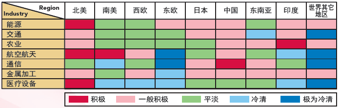 表8是ILS對工業(yè)激光加工市場的機遇的總結(jié)。這張圖表總結(jié)了工業(yè)激光器在全球市場的發(fā)展機遇,主要是基于已發(fā)布的關(guān)鍵行業(yè)的銷售報表和訂單庫存。本報告中呈現(xiàn)的表格已是最新版本,并已考慮了上述提及的全球經(jīng)濟情況。簡單來說,我們應(yīng)該在所有紅色、粉紅色的領(lǐng)域加強表現(xiàn),同時也要關(guān)注綠色部分。北美和亞洲(日本、中國、東南亞和印度)是活躍的制造業(yè)市場,在這些地區(qū),能源、交通、航空航天和金屬零件加工等市場還比較積極,或者至少是一般積極。