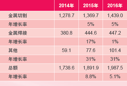 隨著全球汽車行業(yè)在2015年初的復(fù)起(盡管中國、俄羅斯、南美和東南亞地區(qū)的增長放緩),激光焊接獲得了急劇的增加。北美地區(qū)小型SUVs和輕型卡車市場的火熱,以及歐洲汽車銷售的復(fù)蘇,都起到了作用。由于汽車制造商青睞只能用激光焊接的高強度鋼和需要高要求外觀的車身設(shè)計,激光焊接/激光釬焊重振旗鼓。因此,激光器在焊接領(lǐng)域獲得了17%的增長(表6)。對2016年的預(yù)測就不是很樂觀,大眾汽車丑聞造成的銷售下降可能會讓這個領(lǐng)域只有很低的個位數(shù)增長。