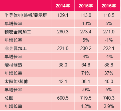 表1:工業(yè)激光器市場的銷售收入(貨幣單位:百萬美元)