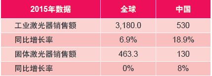 表1:2015年全球及中國工業(yè)激光器與固體激光器銷售情況(百萬美元)