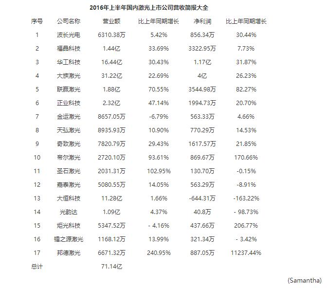 截至今年年中,國(guó)內(nèi)激光上市公司基本上已經(jīng)發(fā)布了2016上半年業(yè)績(jī)報(bào)告,本網(wǎng)摘錄整理,為讀者一一介紹。本文提及到的上市公司包括了在滬深主板、中小板、創(chuàng)業(yè)板和新三板上市的激光相關(guān)公司,涉及公司的業(yè)績(jī)總量為71.17億元,這些公司都是國(guó)內(nèi)激光行業(yè)比較出色的代表,從他們的業(yè)績(jī)情況,基本上可以窺探國(guó)內(nèi)2016上半年激光產(chǎn)業(yè)的情況與發(fā)展趨勢(shì)。需要說(shuō)明的是,本文提及的激光上市公司,有個(gè)別公司業(yè)績(jī)不完全是激光業(yè)務(wù),包括華工科技、正業(yè)科技、大恒科技等,它們還有其他非激光業(yè)務(wù)。 從總體來(lái)看,2016年上半年大多數(shù)激光上市公司的業(yè)績(jī)都有大幅度的增長(zhǎng),在制造業(yè)持續(xù)低迷的大背景下,激光產(chǎn)業(yè)的發(fā)展顯得更加生機(jī)蓬勃。然而也不得不注意到,國(guó)內(nèi)經(jīng)濟(jì)發(fā)展放緩、行業(yè)內(nèi)競(jìng)爭(zhēng)激烈等因素對(duì)部分上市公司造成了明顯影響,使得這些公司的凈利潤(rùn)出現(xiàn)了一定程度下降。 以下來(lái)給各位詳細(xì)介紹: 波長(zhǎng)光電營(yíng)收6310.38萬(wàn)元,凈利潤(rùn)同比增長(zhǎng)30.44% 波長(zhǎng)光電2016上半年業(yè)績(jī)“雙豐收”,其中,營(yíng)業(yè)收入6310.38萬(wàn)元,同比增長(zhǎng)5.42%;歸屬于掛牌公司股東的凈利潤(rùn)856.34萬(wàn)元,同比增長(zhǎng)30.44%。波長(zhǎng)光電表示,營(yíng)業(yè)收入比上年同期增加了5.42%,主要是因?yàn)楣镜闹饕a(chǎn)品元件類產(chǎn)品較去年同期銷售增長(zhǎng)了360萬(wàn)元。此外,波長(zhǎng)光電在研發(fā)上也是成果頗多,據(jù)了解,波長(zhǎng)光電今年上半年新增了4項(xiàng)專利。 福晶科技營(yíng)收1.44億,同比增長(zhǎng)33.69% 福晶科技2016上半年實(shí)現(xiàn)營(yíng)業(yè)收入14,361.79萬(wàn)元,比上年同期增長(zhǎng)33.69%;實(shí)現(xiàn)營(yíng)業(yè)利潤(rùn)3,963.09萬(wàn)元,比上年同期增長(zhǎng)16.29%;實(shí)現(xiàn)歸屬于上市公司股東的凈利潤(rùn)3,322.95萬(wàn)元,比上年同期增長(zhǎng)7.73%。 2016年固體激光器發(fā)展勢(shì)頭強(qiáng)勁,公司充分發(fā)揮在該領(lǐng)域的龍頭優(yōu)勢(shì),合理安排產(chǎn)能,提升生產(chǎn)效率,晶體類產(chǎn)品實(shí)現(xiàn)41.94%的增長(zhǎng),繼續(xù)保持了優(yōu)勢(shì)地位。 華工科技營(yíng)收16.44億,激光設(shè)備銷售增長(zhǎng)71% 華工科技2016上半年實(shí)現(xiàn)營(yíng)業(yè)收入16.44億元,同比增長(zhǎng)30.43%;歸屬于上市公司股東的凈利潤(rùn)1.17億元,同比增長(zhǎng)31.87%。報(bào)告期內(nèi),公司光電器件和激光加工業(yè)務(wù)板塊收入比有較大幅度的增長(zhǎng),從而提升了公司盈利水平。 激光設(shè)備和光通信器件銷售高增長(zhǎng),大超市場(chǎng)預(yù)期。激光設(shè)備制造板塊實(shí)現(xiàn)銷售收入5.90億元,同比增長(zhǎng)71.08%,毛利率提升3.46%至29.41%,主要因國(guó)際市場(chǎng)的拓展成效顯現(xiàn),中小功率系列產(chǎn)品銷售額大幅度提升,以及高功率智能裝備業(yè)務(wù)的穩(wěn)步推進(jìn)。 大族激光營(yíng)收31.22億元,同比增長(zhǎng)22.7% 大族激光2016上半年?duì)I業(yè)收入為31.22 億元,同比增長(zhǎng)22.69%;歸屬上市公司股東凈利潤(rùn)為4.00 億元,同比增長(zhǎng)26.23%;歸屬上市公司股東扣非凈利潤(rùn)為3.90 億元,同比增長(zhǎng)37.22%。 公司小功率激光器今年受到國(guó)際大客戶加工設(shè)備更新需求的拉動(dòng)增長(zhǎng)較為明顯,但由于一方面大客戶的設(shè)備投資趨于謹(jǐn)慎,另一方面交期以及訂單確認(rèn)的時(shí)間差導(dǎo)致部分訂單尚未確認(rèn)收入,影響上半年收入增速。公司的多項(xiàng)新業(yè)務(wù)拓展迅速,動(dòng)力電池設(shè)備未來(lái)有望為公司貢獻(xiàn)新的增長(zhǎng)點(diǎn)。 聯(lián)贏激光營(yíng)收1.88億,同比增長(zhǎng)70.55% 聯(lián)贏激光2016上半年實(shí)現(xiàn)營(yíng)業(yè)收入18,779.22萬(wàn)元,同比增長(zhǎng)70.55%;實(shí)現(xiàn)凈利潤(rùn)3,544.98萬(wàn)元,比去年同期增長(zhǎng)82.27%。業(yè)績(jī)大幅增長(zhǎng)主要原因是:新能源汽車行業(yè)爆發(fā)增長(zhǎng),帶來(lái)龐大市場(chǎng)空間,以及生產(chǎn)能力得到提高。 正業(yè)科技營(yíng)收2.32億,同比增長(zhǎng)47.14% 正業(yè)科技2016上半年?duì)I業(yè)收入23,212.85萬(wàn)元,比上年同期上升47.14%,實(shí)現(xiàn)利潤(rùn)總額2,119.50萬(wàn)元,比上年同期上升10.13%,實(shí)現(xiàn)凈利潤(rùn)1,994.73萬(wàn)元,比上年同期上升20.70%;其中,實(shí)現(xiàn)歸屬于母公司股東的凈利潤(rùn)1,994.73萬(wàn)元,比上年同期上升20.70%。 雖然國(guó)內(nèi)整體市場(chǎng)經(jīng)濟(jì)環(huán)境較差,但因公司PCB業(yè)務(wù)實(shí)現(xiàn)了穩(wěn)健發(fā)展,在鋰電行業(yè)的訂單較為充足以及被并購(gòu)企業(yè)實(shí)現(xiàn)了財(cái)務(wù)并表。公司X光系列檢測(cè)設(shè)備取得了較好的銷售業(yè)績(jī),特別是在動(dòng)力電池領(lǐng)域的銷售取得了重大突破。 金運(yùn)激光營(yíng)收8657.05萬(wàn),同比下降6.79% 金運(yùn)激光2016上半年實(shí)現(xiàn)營(yíng)業(yè)收入8657.05萬(wàn)元,較上年同期減少6.79%,歸屬于母公司所