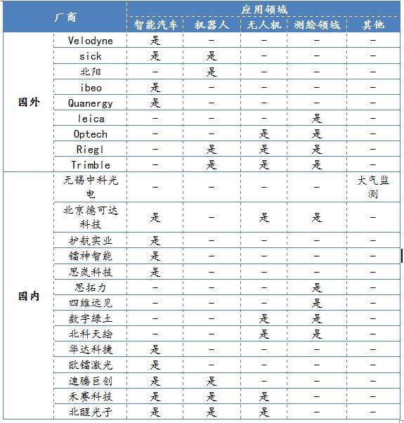 由于固態(tài)式激光雷達(dá),不具備旋轉(zhuǎn)組件,這在一定程度降低了硬件成本和磨損消耗,且在個別光束陣元損壞的前提下,固態(tài)式激光雷達(dá)整體仍可持續(xù)工作,在可靠性上實現(xiàn)了大大提升。 二、激光雷達(dá)的主要應(yīng)用領(lǐng)域 激光雷達(dá)的下游應(yīng)用領(lǐng)域核心是掃地機(jī)器人、AVG小車、汽車自動駕駛、無人駕駛、空間測繪和無人機(jī)等領(lǐng)域。從目前全球激光雷達(dá)企業(yè)的下游應(yīng)用領(lǐng)域分布來看,居多的仍然是智能汽車和機(jī)器人領(lǐng)域。