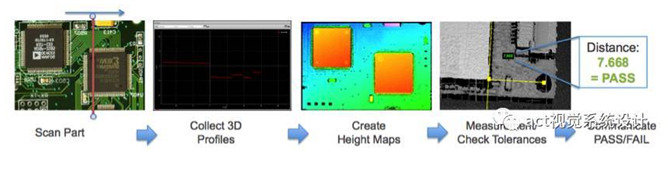 五、3D測量的優(yōu)勢 2D視覺無法實現(xiàn)100%的質(zhì)量控制,它無法獲取掃描零件的幾何形狀數(shù)據(jù),導(dǎo)致與形狀有關(guān)的關(guān)鍵特征丟失。而3D測量能夠提供如下優(yōu)勢: ¨體積測量(X、Y和Z軸)提供與形狀和位置相關(guān)的參數(shù) ¨對比度不明顯的情況下,是檢查低對比度物體的理想選擇 ¨不受輕微的照明變化或環(huán)境光的影響 ¨光源和相機集成于傳感器內(nèi)部,并經(jīng)過預(yù)交準(zhǔn)能獲取更高的重復(fù)性 ¨易于組成多傳感器網(wǎng)絡(luò),用于掃描各種大型或復(fù)雜的工件 六、生產(chǎn)過程中的在線檢測 典型的在線檢測過程包括掃描、測量和控制,所有這些都在高度優(yōu)化的流水線操作流程中執(zhí)行,以跟上工廠的生產(chǎn)速度。 以下總結(jié)了檢測過程中的關(guān)鍵處理步驟: ¨通過組合這些圖像文件,生成高密度3D點云 ¨使用內(nèi)置測量工具計算測量值 ¨對照預(yù)設(shè)公差檢查測量結(jié)果 ¨通知工廠網(wǎng)絡(luò)和設(shè)備“合格/不合格”決定