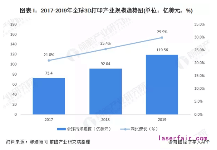 為解決疫情防控中應(yīng)急物資短缺的難題,美國、意大利等國紛紛利用3D打印機(jī)生產(chǎn)呼吸機(jī)配件、個(gè)人防護(hù)面罩,甚至還創(chuàng)建了在線論壇,用于政府、醫(yī)院、非政府組織發(fā)布需求,以及業(yè)內(nèi)人士分享經(jīng)驗(yàn)等。3D打印在全球疫情防控中發(fā)揮的作用,反映出這項(xiàng)技術(shù)普及度的提高和應(yīng)用領(lǐng)域的擴(kuò)展。全球3D打印市場規(guī)模破百億美元3D打印技術(shù)最早可以追溯到1976年噴墨打印機(jī)的發(fā)明。20世紀(jì)80年代以后,3D打印行業(yè)受到國內(nèi)外的廣泛關(guān)注,各種3D打印技術(shù)也在多個(gè)行業(yè)應(yīng)用并發(fā)展。目前已覆蓋了制造、醫(yī)療、教育、航空航天、軍事等多個(gè)領(lǐng)域。根據(jù)2020年3月賽迪顧問發(fā)布的《2019年全球及中國3D打印行業(yè)數(shù)據(jù)》,2019年,全球3D打印產(chǎn)業(yè)規(guī)模達(dá)119.56億美元,增長率為29.9%,同比增長增加4.5%。