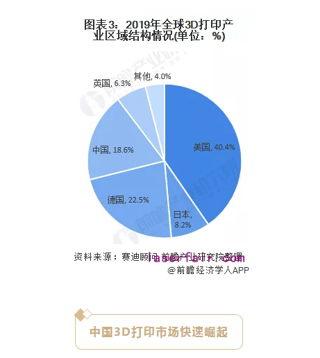 2019年美國產(chǎn)業(yè)規(guī)模占全球比重40.4%,德國僅次于美國,中國位居第三。作為3D打印起步較晚的中國,近幾年,抓緊自主創(chuàng)新和研發(fā),雖然和國外的技術(shù)還有一定差距,但也一步步朝著精細(xì)化和專業(yè)發(fā)展。當(dāng)然,國內(nèi)巨大的市場潛能,也吸引了不少國外3D打印行業(yè)巨頭的目光和投資,進(jìn)一步推動(dòng)了中國3D打印產(chǎn)業(yè)的發(fā)展。