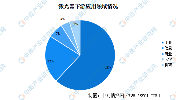 激光器的性能決定著激光設(shè)備輸出光束的質(zhì)量和功率,是下游激光設(shè)備最核心的部件之一。根據(jù)增益介質(zhì)的不同,激光器可分為光纖激光器、半導(dǎo)體激光器、固體激光器和氣體激光器。其中,光纖激光器因高效率、多用途、低維護(hù)成本的特點(diǎn)受到下游客戶的青睞。在應(yīng)用領(lǐng)域,光纖激光器已成為最大的激光器品類,市場份額超過一半。光纖激光器主要應(yīng)用在工業(yè)領(lǐng)域,而醫(yī)學(xué)領(lǐng)域主要還是以半導(dǎo)體、固體及氣體激光為主,三者合計(jì)占比49%。