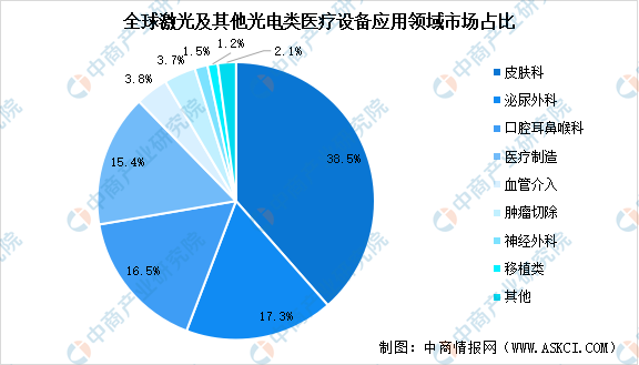 在醫(yī)療領(lǐng)域中,激光及其他光電類醫(yī)療器械逐漸普及,已廣泛運(yùn)用于眼科(如近視矯正、視網(wǎng)膜修補(bǔ)等)、外科(激光手術(shù)刀)、內(nèi)科、婦科、耳鼻喉科、心血管科、皮膚科等多個(gè)領(lǐng)域。2021年,全球激光及其他光電類醫(yī)療設(shè)備應(yīng)用市場中,皮膚治療類應(yīng)用依然是占比最大的領(lǐng)域,占比約為38.5%;其次是泌尿外科、口腔耳鼻喉科和醫(yī)療制造領(lǐng)域,占比分別為17.3%、16.5%和15.4%;隨后是血管介入治療、腫瘤切除、神經(jīng)外科手術(shù)領(lǐng)域,占比分別為3.8%、3.7%和 1.5%。