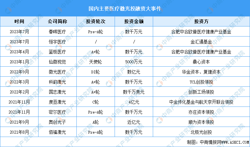 近年來,激光醫(yī)療企業(yè)在資本市場的表現(xiàn)活躍。2023年7月,春暉醫(yī)療宣布完成數(shù)千萬元人民幣的Pre-A輪融資,本輪融資由合肥中合歐普醫(yī)療健康產(chǎn)業(yè)基金領(lǐng)投,友博資本的成員企業(yè)上海展臣揚(yáng)帆新材料有限公司聯(lián)合投資。2023年4月,藍(lán)極醫(yī)療完成由合肥中合歐普醫(yī)療健康產(chǎn)業(yè)基金領(lǐng)投、陜投成長基金參與的數(shù)千萬元A+輪融資,募集資金將用于藍(lán)激光微創(chuàng)、光動(dòng)力診療一體化設(shè)備,光生物調(diào)節(jié)等系列創(chuàng)新產(chǎn)品的研發(fā)、臨床研究等。