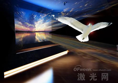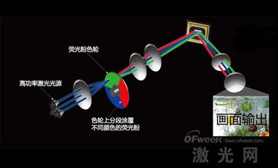 OFweek激光網(wǎng)訊:2014年,電視技術(shù)由以前“單一性”變成了“多樣化”,曲面液晶電視讓用戶有更多的選擇,全新的觀看方式給用戶身臨其境的視覺體驗;LG孜孜不倦的耕耘OLED電視總有獲得回報的一天;量子點QLED盡管只是過渡技術(shù),但同樣值得關(guān)注,畢竟液晶還將存活于市場中很多年;激光電視則是高端玩家的另一個選擇。即將到來的2015年,我們希望電視技術(shù)能夠進一步得到發(fā)展和應(yīng)用。 激光電視由激光電視主機和屏體兩個部分組成,兩者的關(guān)系密不可分。和投影機產(chǎn)品不同的是,激光電視是以激光為光源,并不再需要以燈泡為光源。從下面的圖片中,大家就可以了解到激光電視的工作原理。首先是使用極高功率的激光光源,在每平方米聚集超過100W的光能量。直觀的說,100W的光能量,足以瞬間讓玻璃和鋼鐵完全融化。因此高能量密度是實現(xiàn)激光電視光源高亮度的關(guān)鍵所在,否則就無法顯示足夠亮度的畫面。 激光電視工作原理示意圖 高速旋轉(zhuǎn)的熒光粉色輪,也是激光電視所必備的。在色輪上,分段涂有不同顏色的熒光粉。當色輪高速旋轉(zhuǎn)的同時,就可以實現(xiàn)不同基色光的發(fā)射,我們就可以看到五顏六色的畫面。而前面我們提到了,由于高功率激光光源的存在,足以瞬間將鋼鐵融化。因此高速旋轉(zhuǎn)的色輪還擔負著另外一項非常重要的功能,那就是讓熒光粉的溫度快速降低,從而避免被高功率激光破壞,已達到正常發(fā)光的目的。