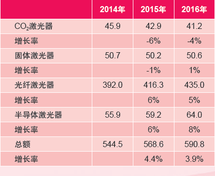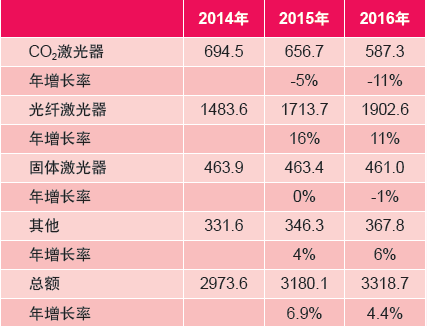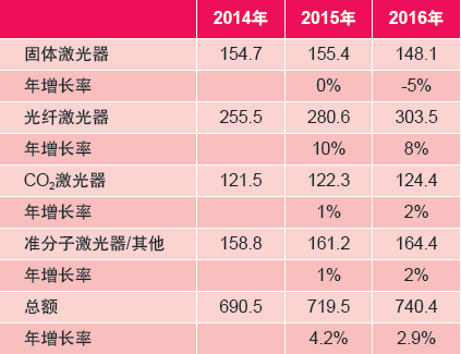表1:工業(yè)激光器市場的銷售收入(貨幣單位:百萬美元)