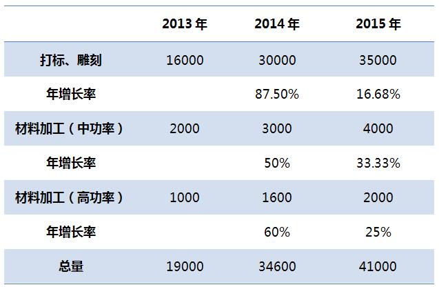 表:按應用分類的國內光纖激光器生產量(數(shù)量單位:臺)