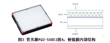 此時的相機相當(dāng)于人眼,接收到的是直接入射到相機的光強,與亮度表達的概念相符,因此經(jīng)理論分析亮度是評價此種光源的最佳指標(biāo)。而其他照明光源例如環(huán)光,相機接收到的是照射到被測樣品后的反射光,如圖2。 相機接收到的是照射到樣品上反射的光,與照度表達的概念相符,因此照度是評價除背光外其他光源是最佳的指標(biāo)。 2.實驗驗證: 為了驗證以上結(jié)論,本文分別用亮度和照度來判定背光源中一個輔助配件-棱鏡膜的作用,同時以相機采集到的數(shù)據(jù)為判定的最終標(biāo)準(zhǔn)。實驗使用的背光源為沃德普的背光源FQ2-50X51,如下圖3:棱鏡膜為3M,該光學(xué)膜材內(nèi)部結(jié)構(gòu)如圖4:
