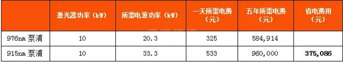 摻鐿光纖在976nm的吸收率是915nm泵浦波長的3倍以上,976nm泵浦技術(shù)方案的單模高功率相比915nm泵浦技術(shù)路線,可以實現(xiàn)3-5kW的單模組高功率激光器,3000W以內(nèi)可現(xiàn)實M2<1.2,同功率單模產(chǎn)品可實現(xiàn)的光束質(zhì)量更高。同時,相比于國內(nèi)的915nm泵浦路線的25-30%光電轉(zhuǎn)化效率,976nm泵浦技術(shù)路線光電轉(zhuǎn)化效率超過42%,在6kW以上的超高功率激光器節(jié)能省電特點及帶來的經(jīng)濟性被充分認識并且是各大激光設(shè)備商一直追逐的方向。如下表所示,10kW的將會省電近40萬元,這將會給終端客戶帶來巨大的經(jīng)濟效用。