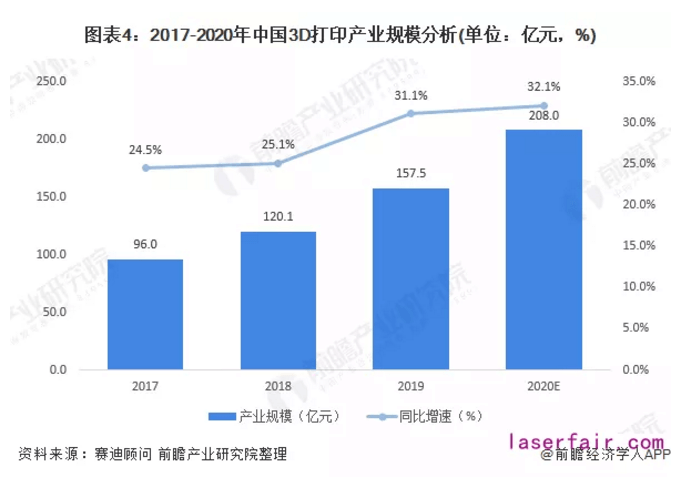 近年來,我國3D打印市場應(yīng)用程度不斷深化,在航空航天汽車、船舶、核工業(yè)、模具等領(lǐng)域均得到了越來越廣泛的應(yīng)用。3D打印技術(shù)已經(jīng)成為航空航天等領(lǐng)域直接制造機(jī)修復(fù)再制造的重要技術(shù)手段。在汽車、船舶、核工業(yè)、模具等領(lǐng)域成為產(chǎn)品設(shè)計(jì)、快速原型制造的重要實(shí)現(xiàn)方式。2017-2020年,我國3D打印產(chǎn)業(yè)規(guī)模逐年增加,增加速度要略快于全球整體增速,以致于我國3D產(chǎn)業(yè)占全球的比重在不斷增加。根據(jù)2020年3月賽迪顧問發(fā)布的《2019年全球及中國3D打印行業(yè)數(shù)據(jù)》,2019年,中國3D打印產(chǎn)業(yè)規(guī)模為157.5億元,較上年增加31.1%。
