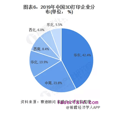 2019年,華東地區(qū)為中國3D打印企業(yè)主要聚集區(qū)域,占據(jù)全國42.4%。中南、華北、西南等地區(qū)也有優(yōu)秀企業(yè)集聚,分別占據(jù)23.8%、13.9%和8.4%的企業(yè)資源。華東地區(qū)的3D打印知名企業(yè)包括湖南華曙高科技有限責(zé)任公司、杭州先臨三維科技股份有限公司、上海光韻達(dá)三維科技有限公司、上海曼恒數(shù)字技術(shù)有限公司;中南地區(qū)的3D打印知名企業(yè)包括深圳市光華偉業(yè)實(shí)業(yè)有限公司、湖北嘉一三維高科股份有限公司等。