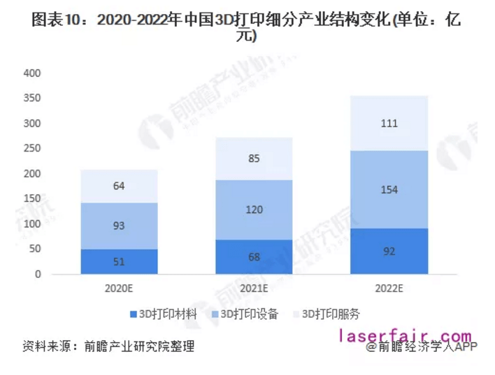 預(yù)計(jì)2020-2022年,3D打印設(shè)備依舊占據(jù)最大份額,占比逐年小幅下降,2022年,產(chǎn)業(yè)規(guī)模為154億元,占比達(dá)到43%。3D打印服務(wù)占比上漲,2022年,產(chǎn)業(yè)規(guī)模為111億元,占比為31%。3D打印材料未來三年占比保持穩(wěn)定,2022年,產(chǎn)業(yè)規(guī)模為92億元,占比26%。