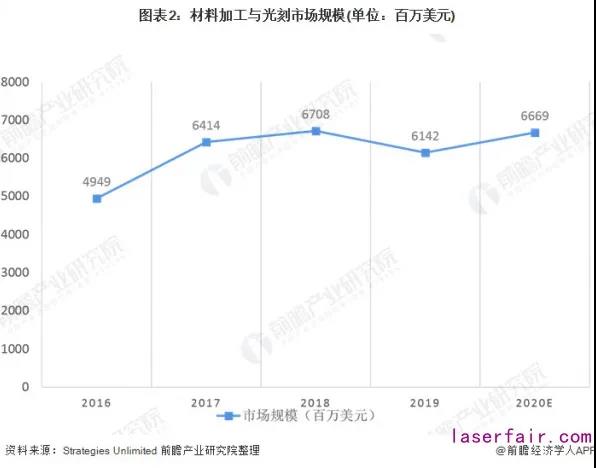 2019年中國激光器在國際市場的競爭力進(jìn)一步增強(qiáng),曾經(jīng)中國生產(chǎn)的光纖激光器大多局限在打標(biāo)應(yīng)用的級別,但近幾年隨著中國激光器產(chǎn)商技術(shù)的進(jìn)步,中國公司能夠提供更高功率的激光產(chǎn)品,導(dǎo)致光纖激光器價格急劇下降。另一方面,美國的貿(mào)易關(guān)稅政策對激光貿(mào)易產(chǎn)生了巨大的不利影響,可以看出,2019年材料加工與光刻的市場規(guī)模有所下降。