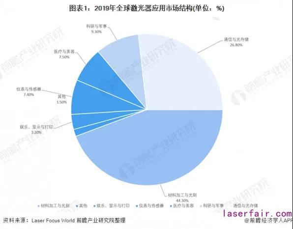 2019年全球激光器應(yīng)用領(lǐng)域中,材料加工與光刻、通信與存儲仍然是全球激光主要應(yīng)用市場,分別占比44.3%及26.8%;其余應(yīng)用領(lǐng)域中科研與軍事占比9.3%,醫(yī)療與美容市場占比7.5%,儀器與傳感器占比7.4%,娛樂、顯示及打印市場占比3.2%。