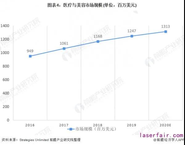 醫(yī)療與美容市場在在經(jīng)過連續(xù)幾年超過10%的增長后,2019年的增長有所放緩,實(shí)現(xiàn)6.7%的增長。醫(yī)療與美容市場的收入主要來自四個細(xì)分市場:美容、眼科、牙科、外科。收入增長的驅(qū)動因素主要來自亞洲的中產(chǎn)階級,而隨著歐亞地區(qū)的經(jīng)濟(jì)增長放緩,這部分人群在這四個細(xì)分市場的消費(fèi)增長也將放緩,預(yù)計(jì)未來醫(yī)療與美容市場規(guī)模增長將放緩。