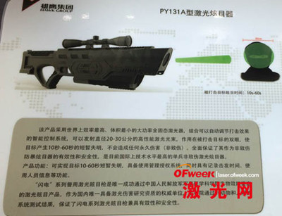 PY131A激光眩目槍為“閃電”系列產(chǎn)品之一,主要用于打擊目標(biāo)雙眼,可目標(biāo)短暫失明10秒至60秒,但不會(huì)產(chǎn)生永久性傷害。同時(shí),該武器系統(tǒng)具有智能管理權(quán)限,可記錄使用人員信息及發(fā)射記錄?捎行Х乐贡I用。 |