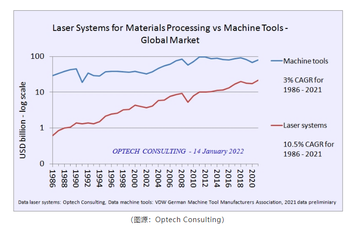 如果這一增長持續(xù)保持在個(gè)位數(shù)的高位,激光系統(tǒng)市場的規(guī)模將在5年內(nèi)達(dá)到300億美元以上,相當(dāng)于目前機(jī)床市場的30%以上。